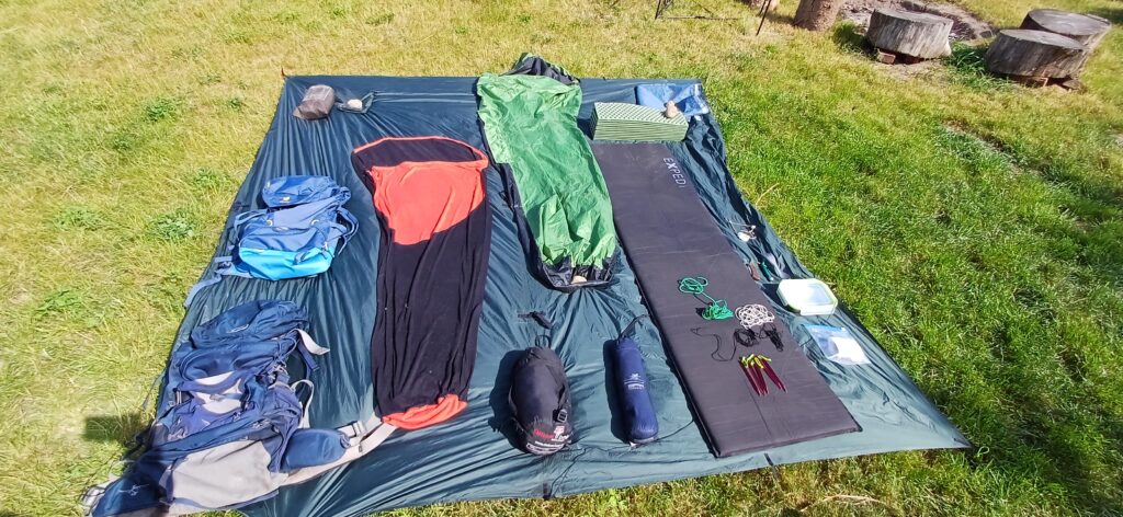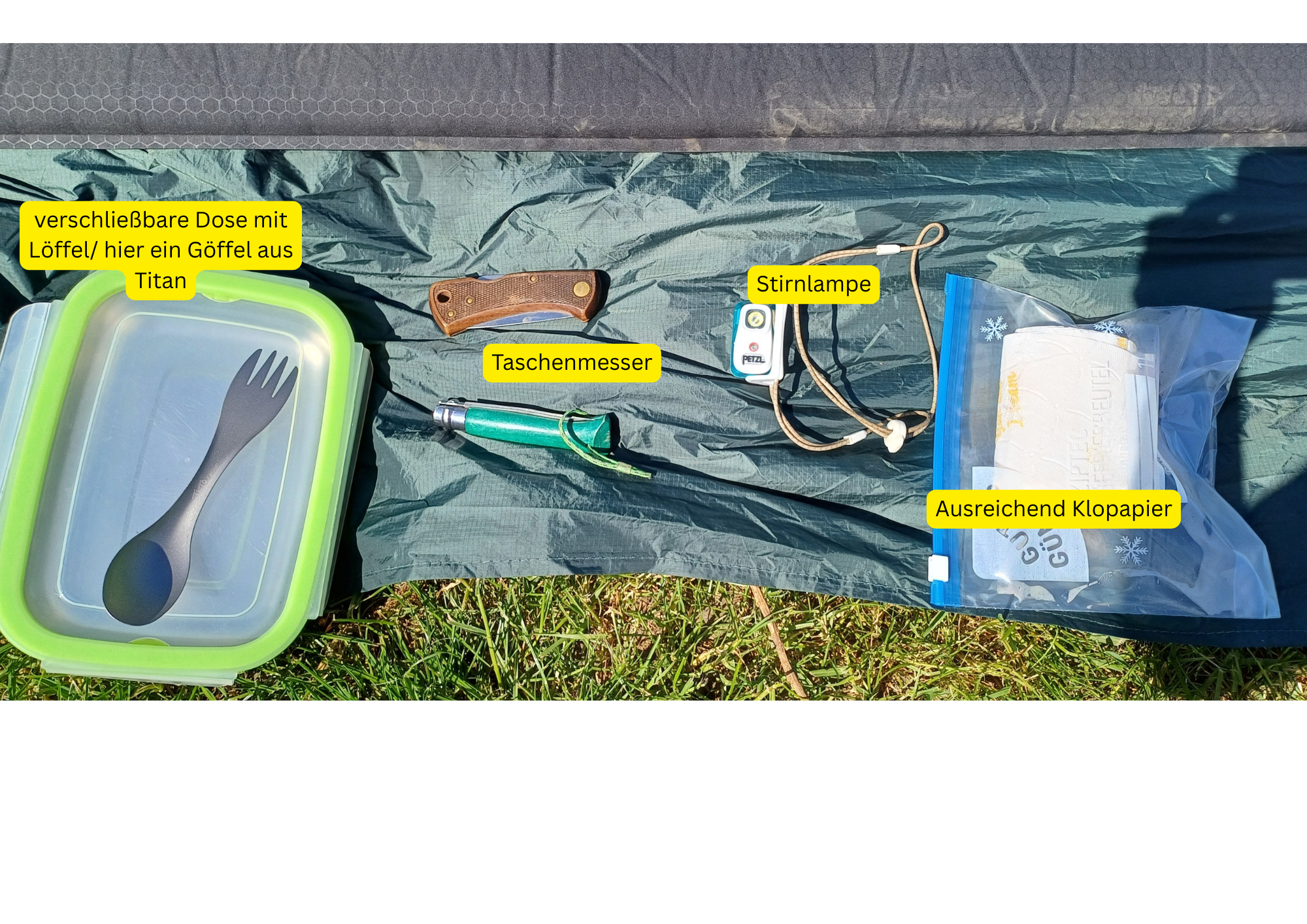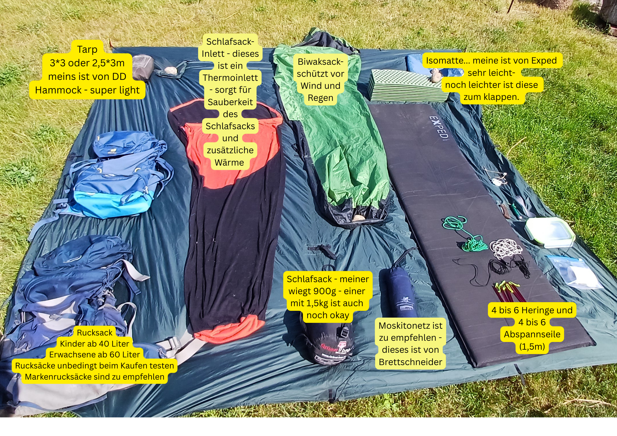 - evtl. eine dünne Unterlage (Folie/Plane) als Schutz für die Isomatte und den Schlafsack