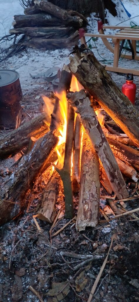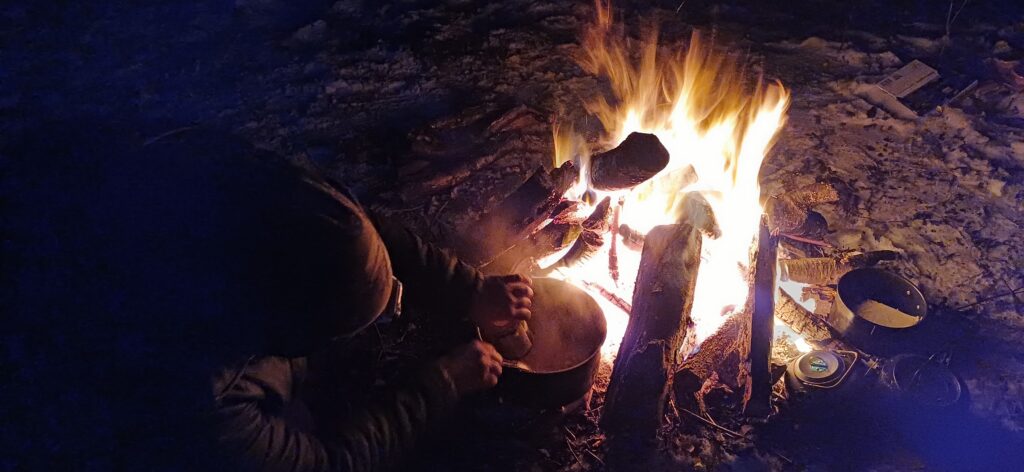 Wir hatten Zeit, uns zu unterhalten. Über das Wesentliche. Jetzt haben wir ein Feuer entfacht, unser Schlaflager aufgebaut und ein gutes Essen genossen. Ich liege in zwei Schlafsäcken eingekuschelt unter meinem Tarp. Ich höre meinen Atem und ich will nur noch flüstern, weil ich den Mond sehen kann. Die Sterne funkeln und dort auf dem Ast sitzt ein Waldkauz. Er unterhält sich offensichtlich mit einem, der weiter weg seine Stimme erhebt. Alles wird ganz ruhig. Mit der Wärmflasche ist mir ganz warm, und doch muss ich mich schützen und noch tiefer in den Schlafsack hineinkrabbeln. Ich höre den Wind. Die Wellen des Sees schwappen hin und wieder an das Ufer. Die letzten Flammen des Feuers knistern noch. So eine Winternacht draußen zu verbringen, ist etwas ganz Besonderes.