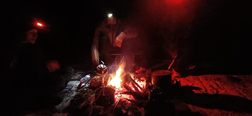 Gemeinsam wandern wir ca. 3km am Fluss entlang, der in einen See mündet. Im Gepäck haben wir alles, was wir brauchen, um warm und sicher draußen zu übernachten. Wenn wir Glück haben, funkeln die Sterne und wir können den Mond aufgehen sehen. Wenn wir am Schlafplatz angekommen sind, sammeln wir Feuerholz und entfachen ein Feuer, damit wir warm bleiben. Wir erhitzen Wasser für unsere Wärmflaschen und setzen einen Tee auf. Dann machen wir uns daran, unser Lager aufzubauen. Wir lassen uns Zeit unsere Taps so aufzubauen, dass wir vor Wind und Regen geschützt sind. Wenn wir unsere Schlafstätten fertig haben, kochen wir gemeinsam. Wir sitzen am Feuer und werden ruhig, erzählen vielleicht eine gemeinsame Geschichte. Irgendwann krabbeln wir in unsere Schlaflager, die uns vor Wind, Kälte und Regen schützen.