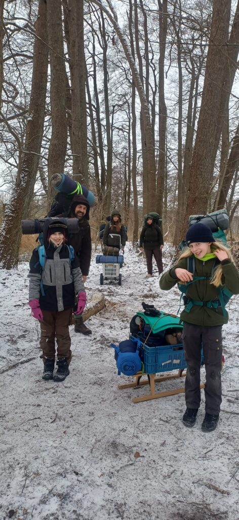 Wir haben Platz für höchstens 10 Personen. Unser Abenteuer findet auch bei leichtem Regen statt, aber nicht bei Sturm oder dollem Regen. Das Essen, Töpfe und Wasserfilter werden auf alle Rucksäcke verteilt. Für das Gruppenequimpment können wir einen Bollerwagen, Wanderwagen oder Schlitten mitnehmen.