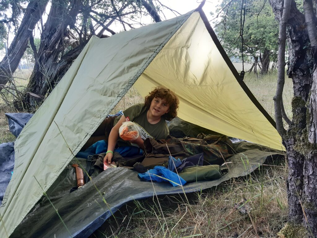 - Tarp oder Plane aus dem Baumarkt, unter die das Kind liegend passt und passende Schnur zum Abspannen.